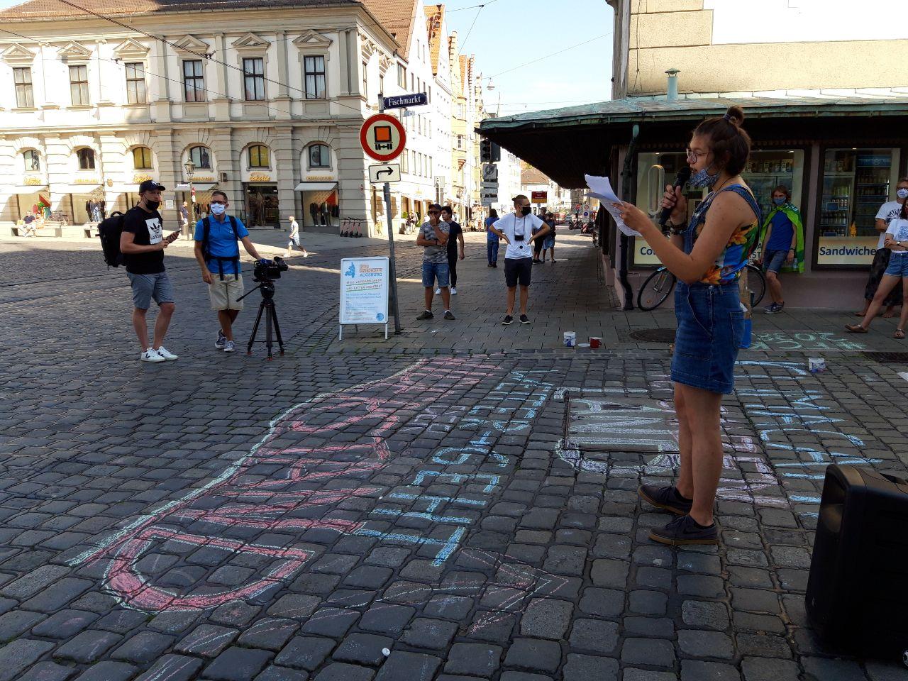Als Ausdruck des Protests gegen unzureichende Klimagerechtigkeitsmaßnahmen bestand das Klimacamp auf dem Fischmarkt neben dem Augsburger Rathaus¹ vom 1. Juli 2020 bis zum 31. Juli 2024. Aktuell ist das Camp pausiert. Wenn du mir über die Geschichte dieses Klimacamps erfahren willst, findest du unter Klimacamp 2020+ viele interessante Informationen.