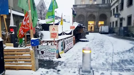 1 Aufgrund der Gefahr durch herabfallende Steine am Perlachturm war das Klimacamp vom 9. Dezember 2021 (Tag 527) bis zum 12. Mai 2022 (Tag 681) zum Moritzplatz umgezogen. Danach haben wir unseren alten Platz in Sichtweite der Augsburger Stadtpolitik wieder eingenommen.