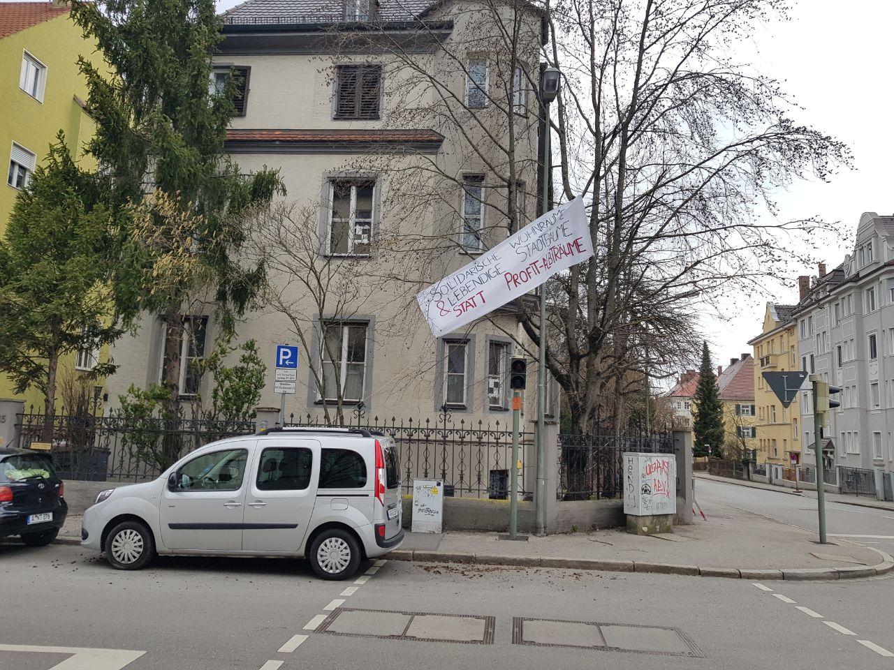 In der Nacht vom Freitag (12.3.) auf den Samstag (13.3.) brachten Klimagerechtigkeitsaktivist*innen ein Banner an einem Baum auf dem Grundstück der von Abbruchplänen bedrohten Diesel-Villa (Hochfeldstraße 15) an: „Solidarische Wohnräume und lebendige Stadtbäume statt Profit-Albträume“. Der neue Eigentümer und Immobilieninvestor Maximilian Wolf plant den Abriss der Diesel-Villa und einen CO2-intensiven Neubau mit teuren Mietwohnungen und einer Tiefgarage [1]. Dieser Neubau würde, so Augsburgs Klimacamper*innen, den Charme des Viertels verletzen und trotzdem keinen Beitrag zu sozialer Gerechtigkeit leisten.